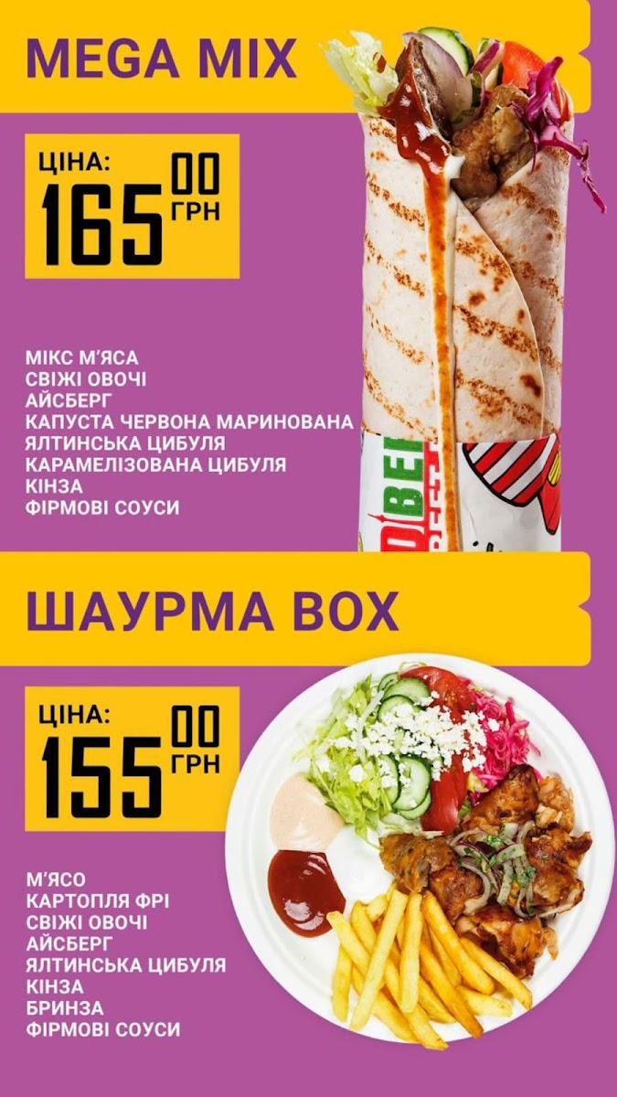 - Mega Mix Shawarma: A hearty serving combining pork and beef, fresh veggies, and caramelized onions, all for UAH 224.00.